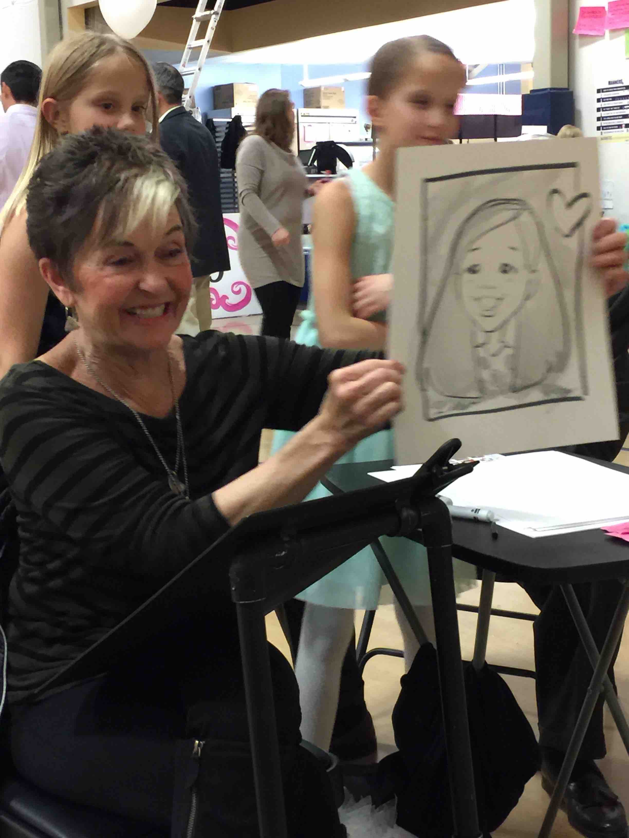 All artists bring clear protective plastic sleeves to place each finished drawing in. This allows folks to show off their drawings afterward around the party or event – and keeps them clean until they make it home safely. Caricatures are often put in a mat or frame and displayed on a wall for years of decoration and smiles, so your party or event is remembered for years to come!